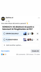 Në një sondazh të zhvilluar online nga Djathtas.al, qytetarët janë pyetur se kë dëshirojnë në postin e Sekretarit të Përgjithshëm të Partisë Demokratike. Gara është mes dy emrave të njohur të PD-së: Ervin Salianji dhe Flamur Noka.